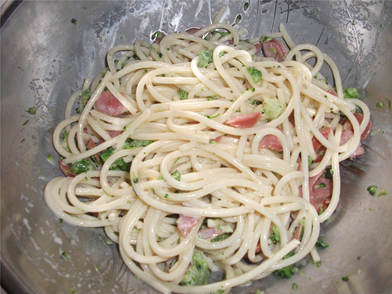 で今朝は、油無しで炒めたウインナーと茹でたブロッコリーのみの具でスパゲティーサラダを作った。