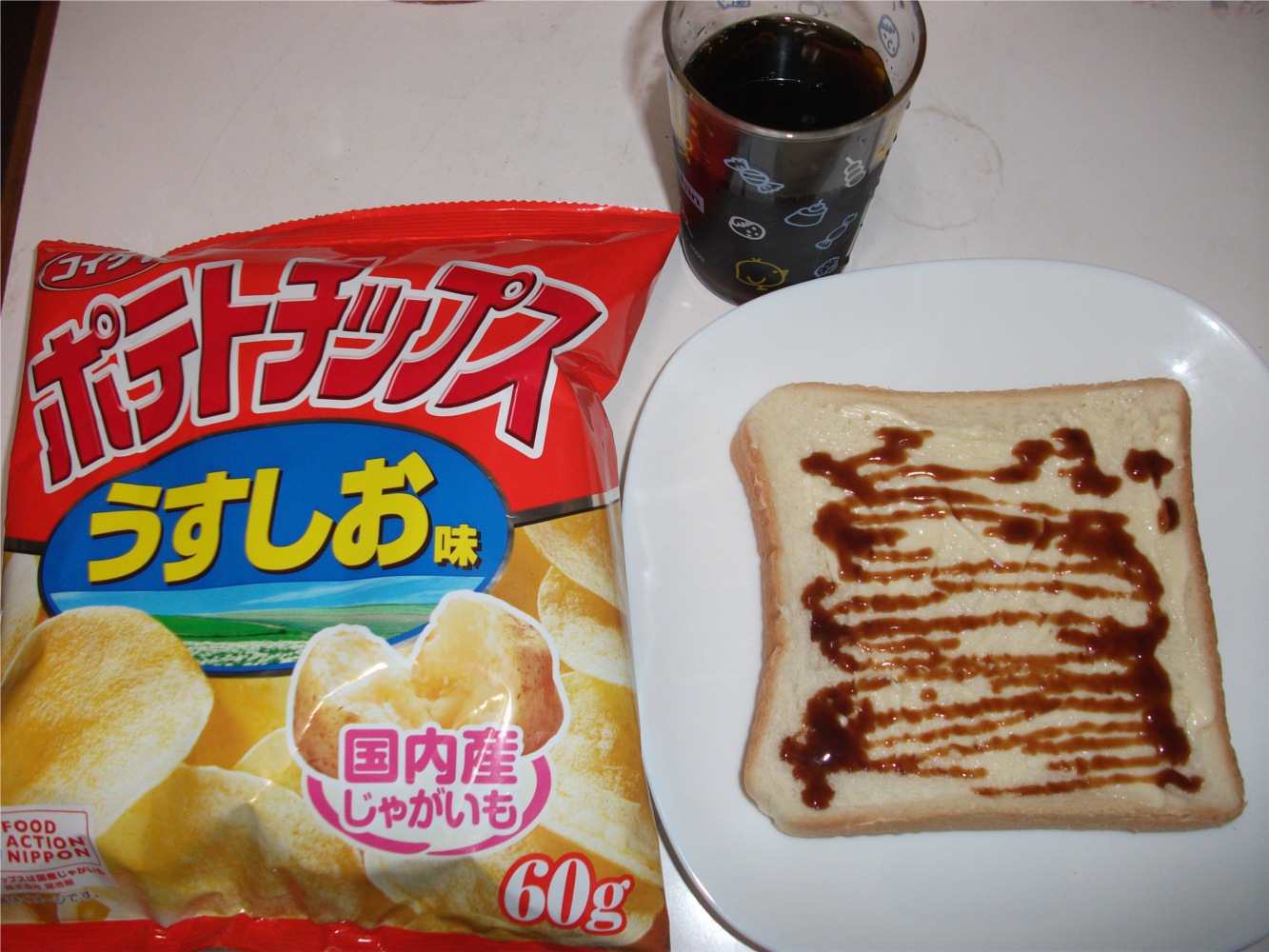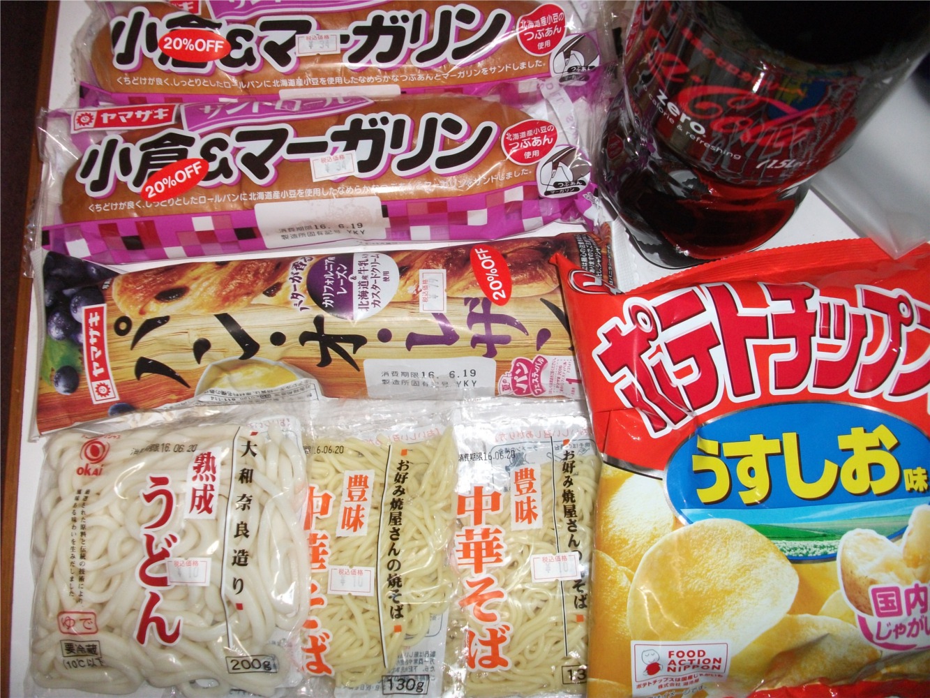 一昨日の夜に買い物した分と夜食(生食パンにマヨ&お好み焼きソース、コーラ)