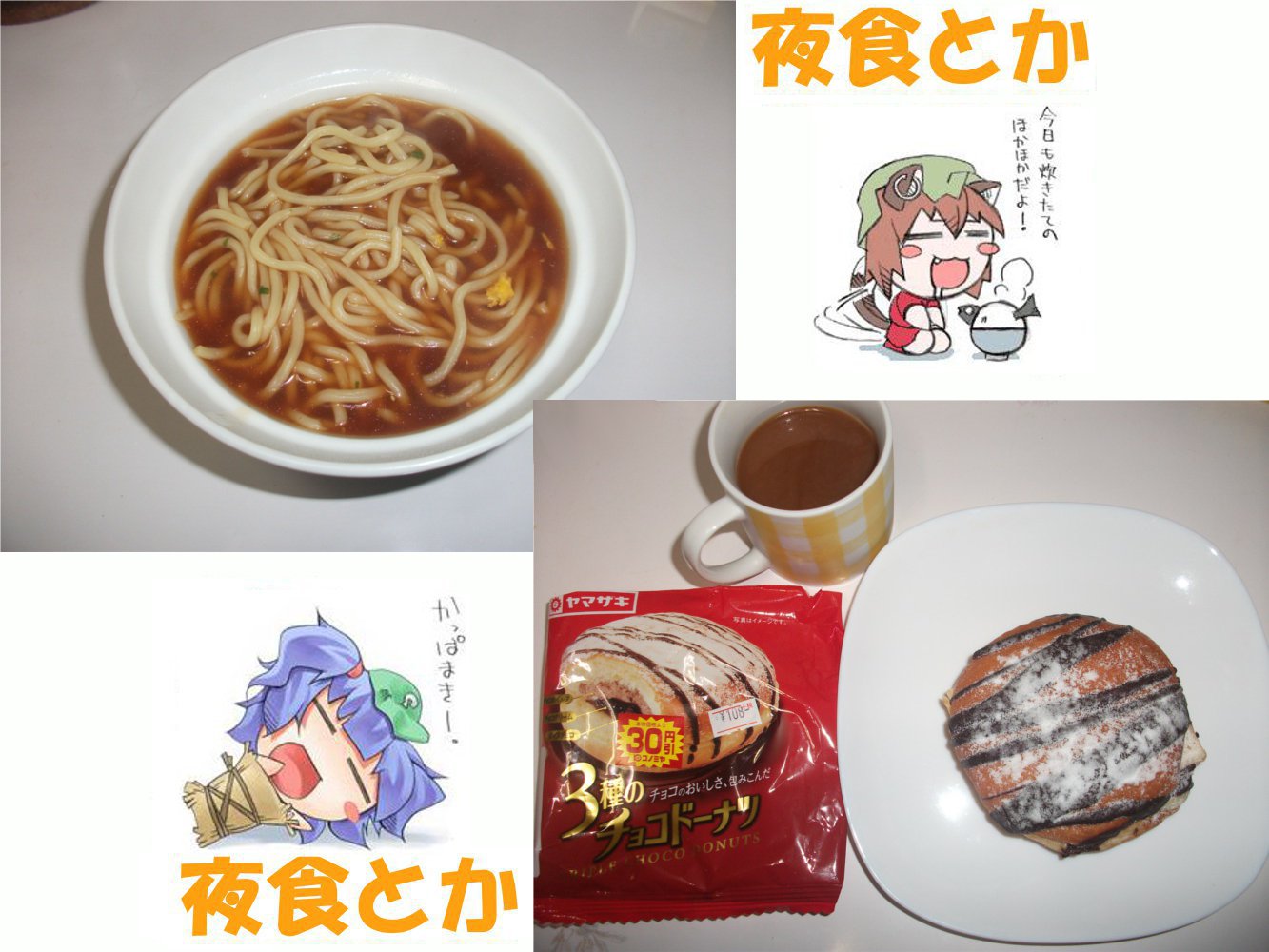 午後9時前後にご飯を食べたのに夜食は麺類と菓子パン (~ω~;)))