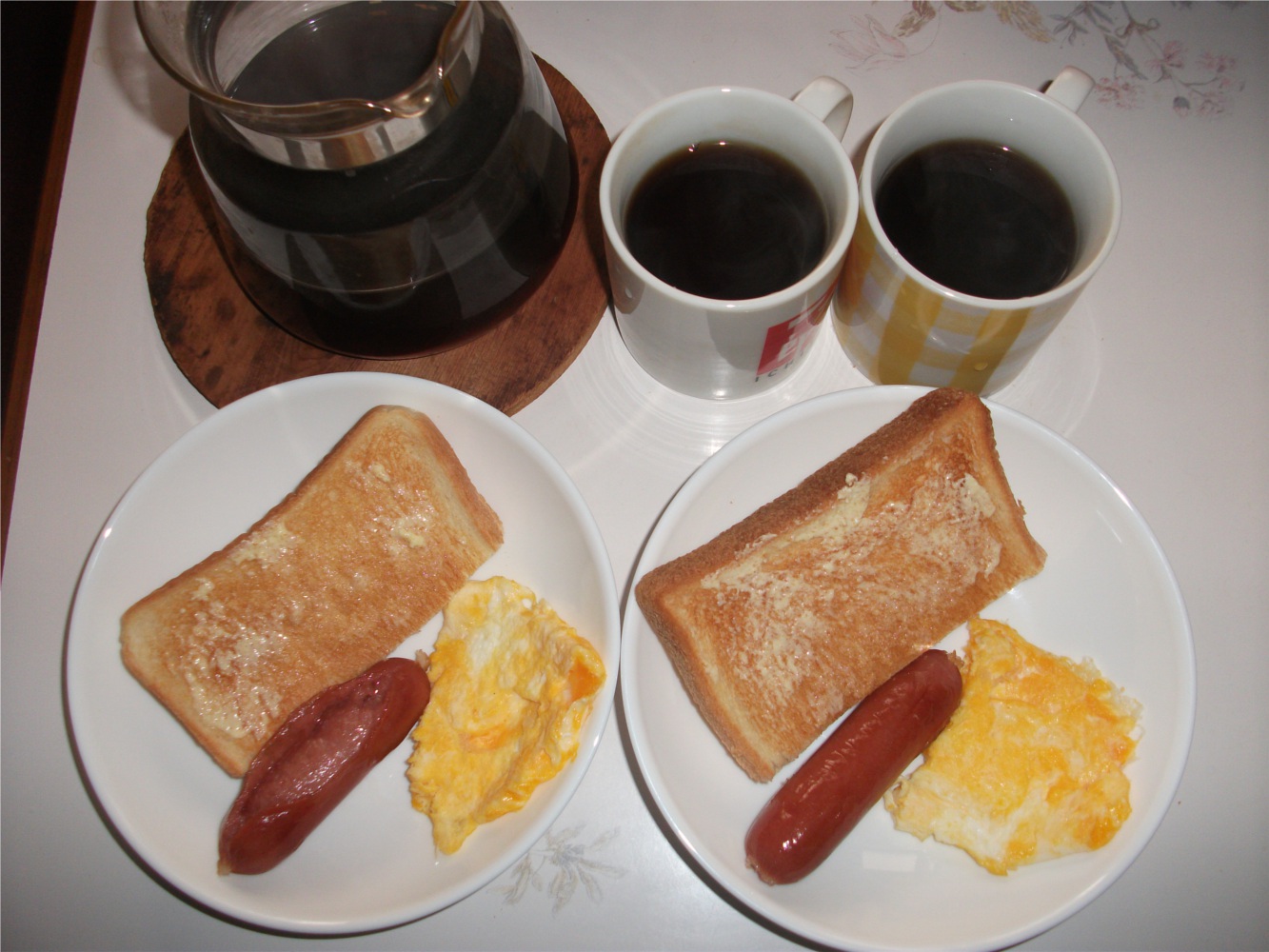 小分けしているから少なく見えるけど、食パン一枚・タマゴ一個・ウインナー2本・コーヒー、いつもどおり時間差で食べる。