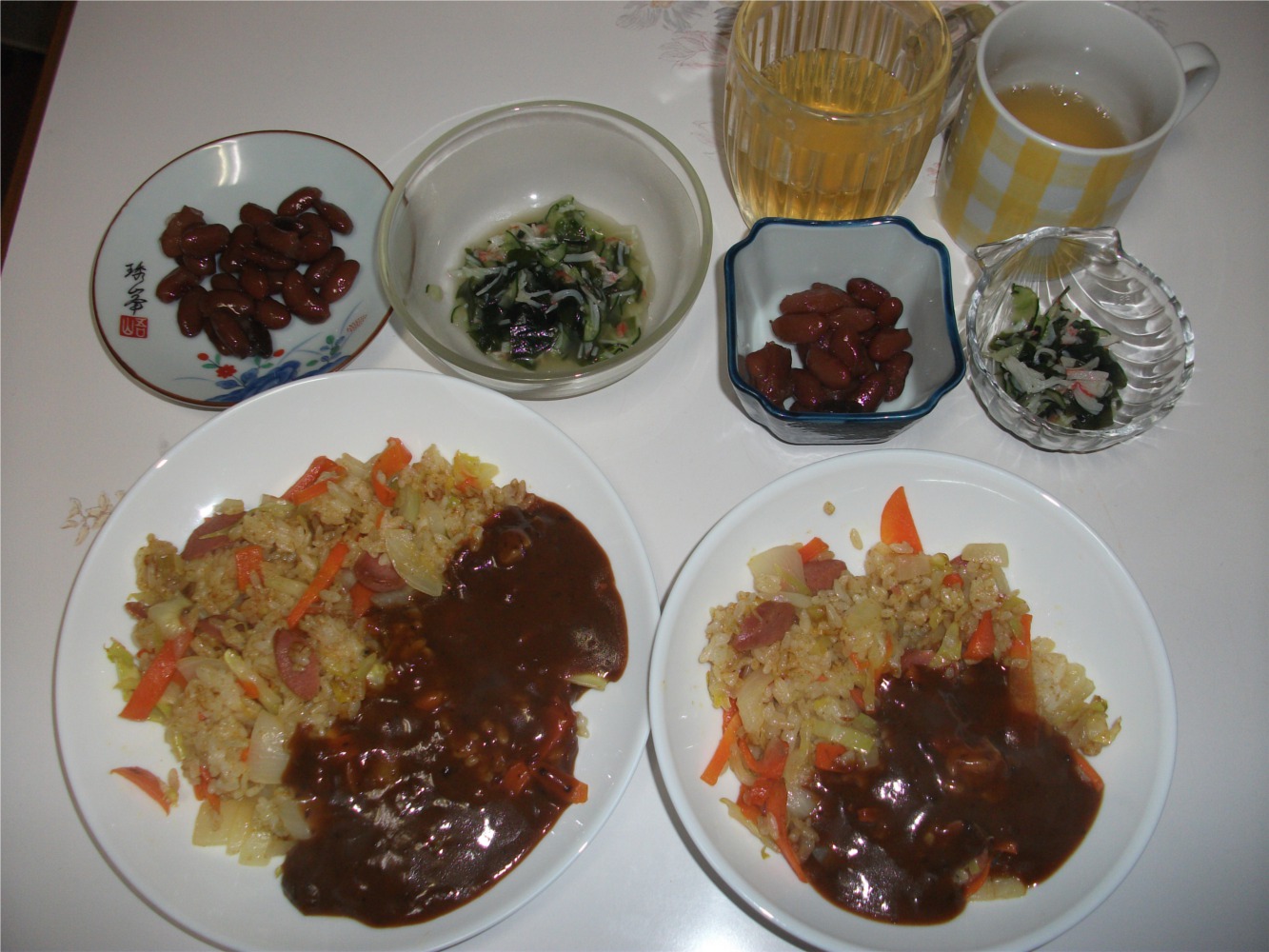 今夜は昨夜半分残したレトルトですが、量的に足りないと思って「野菜たっぷりドライカレー」を作り、残りのレトルトカレーをかけました。