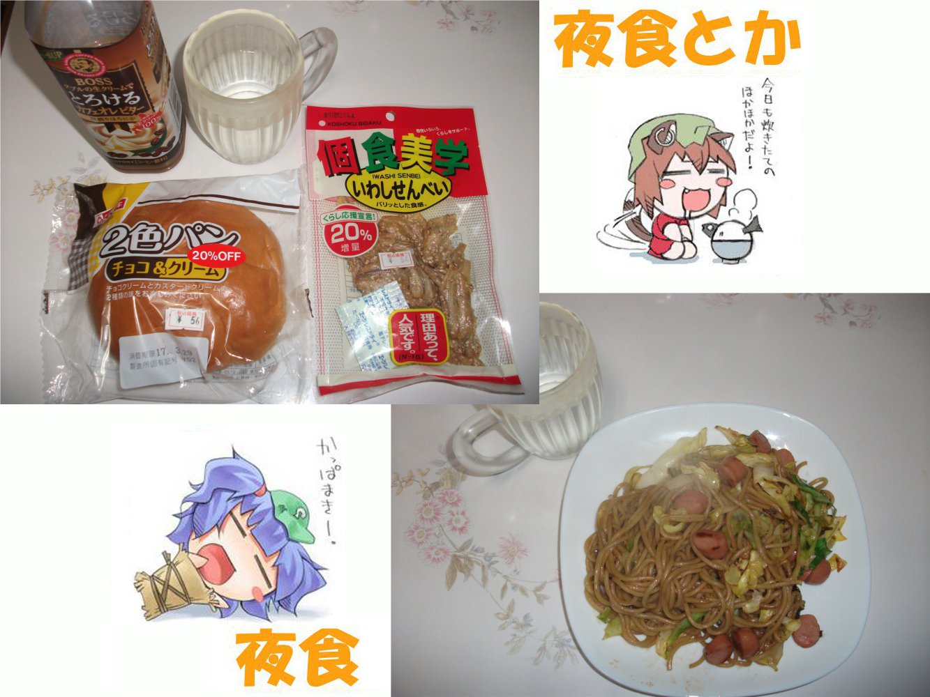 夜食は変更して、菓子パンはやめて消費期限切れ焼きそば麺の処理をしました。