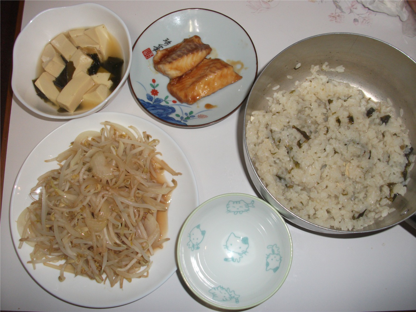 夕食は豆腐を煮た残り汁でのおじや風、山盛りもやし、お惣菜コーナーの魚。