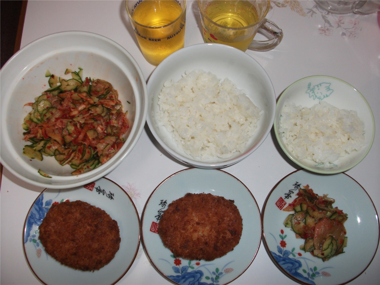 晩ご飯 コロッケ&キムチときゅうりを合わせたもの