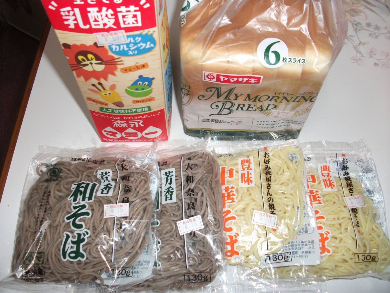 明日の朝の食パンを買ってきた。 食パン64円、森永マミー59円、和そば・中華そば各10円、計 税込163円