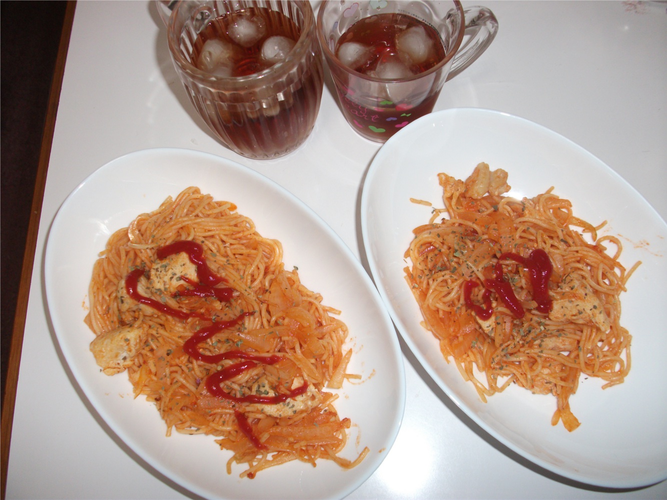 晩ごはん:玉ねぎ・鶏肉・バジルのみの細麺ナポリタン