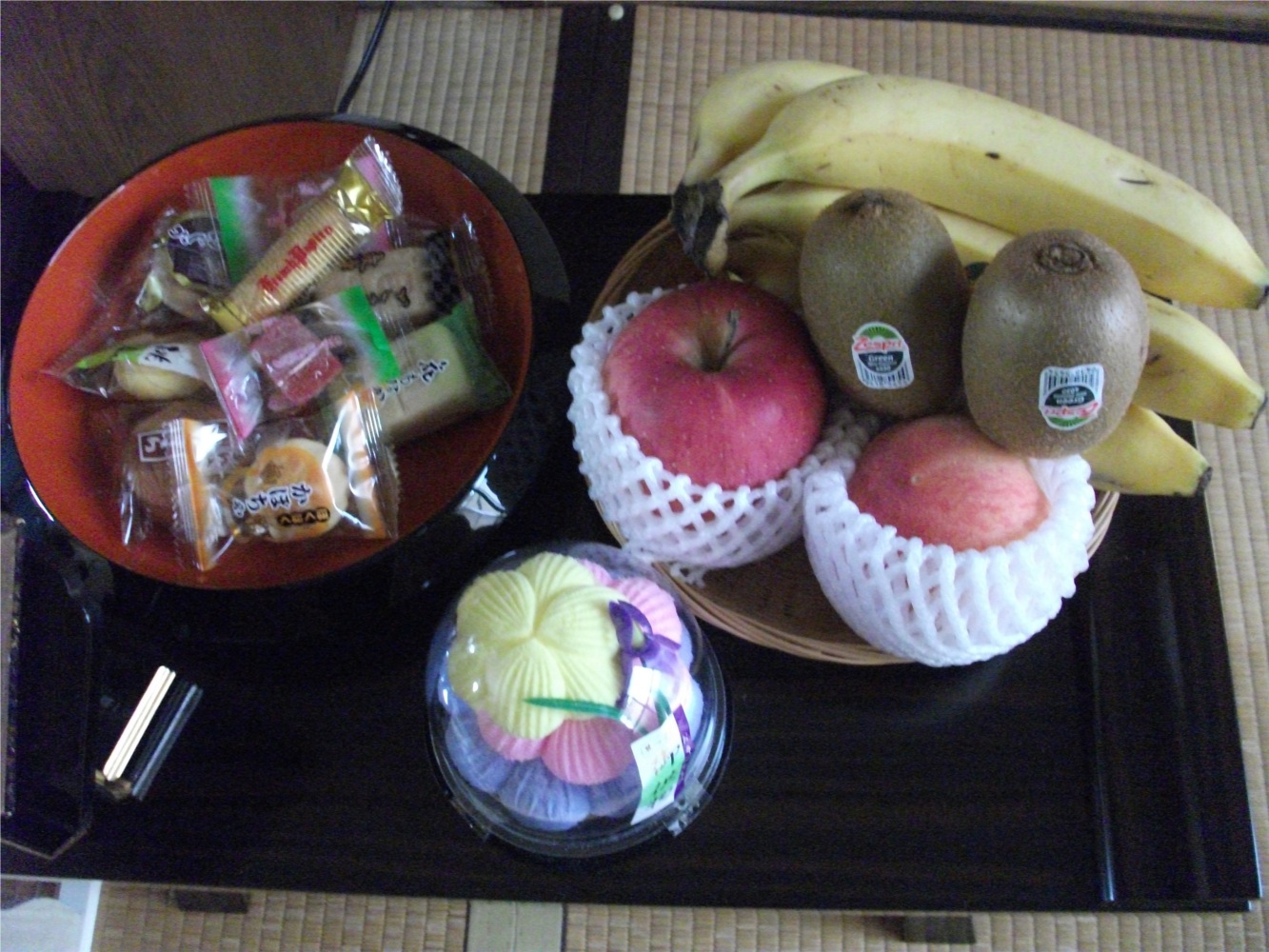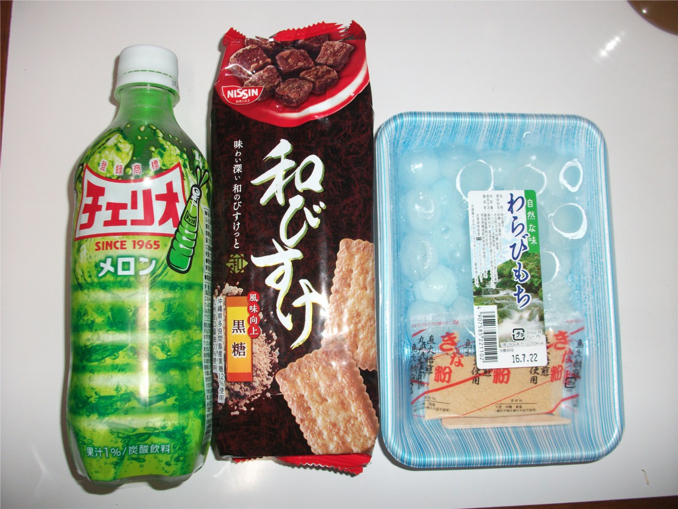 夜食。お昼に買った飲み残し飲料、食べ残しお菓子、わらび餅。