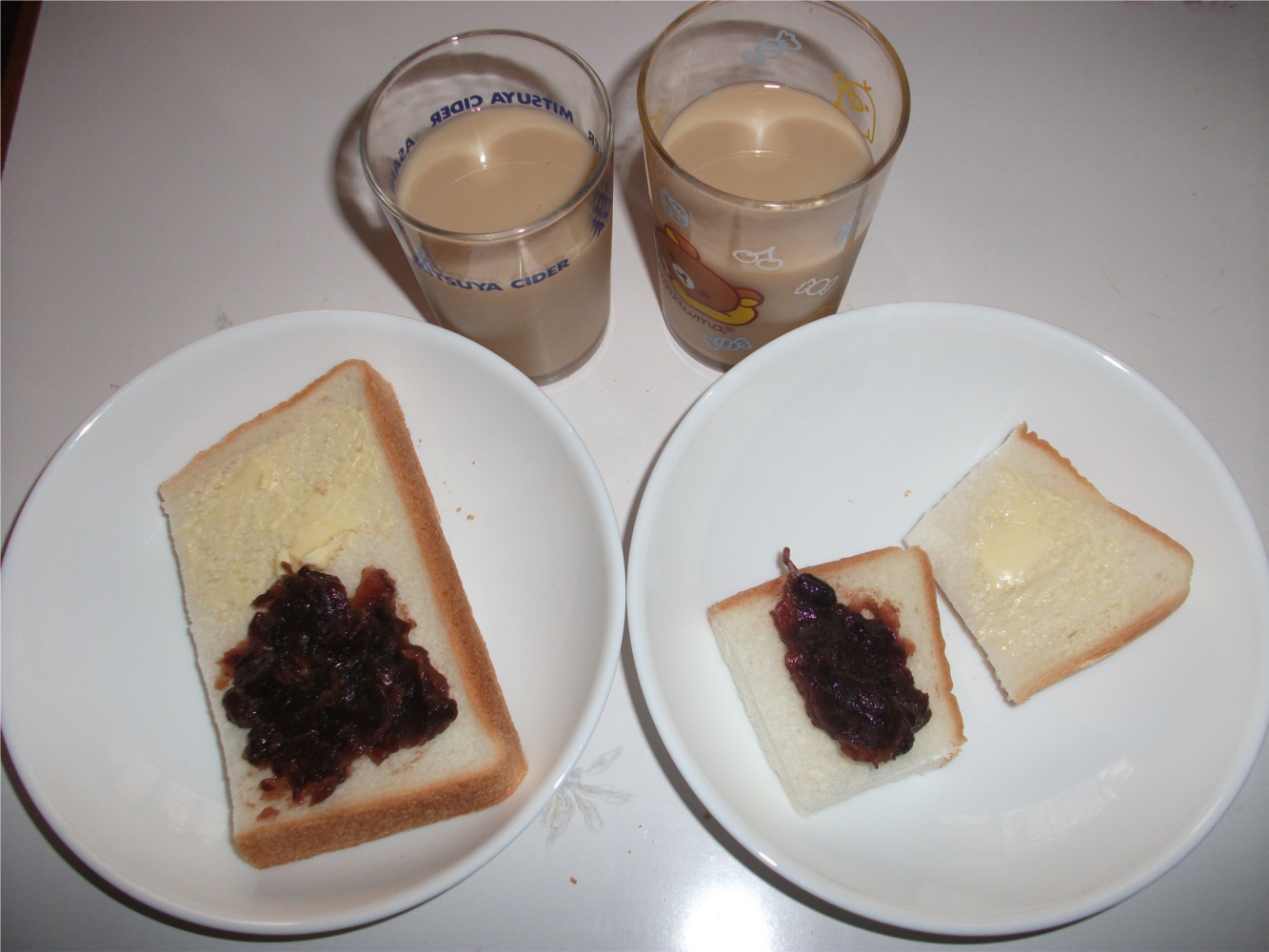 朝ごはんは、生食パンにつぶあんとマーガリン。カフェオレ&牛乳mix