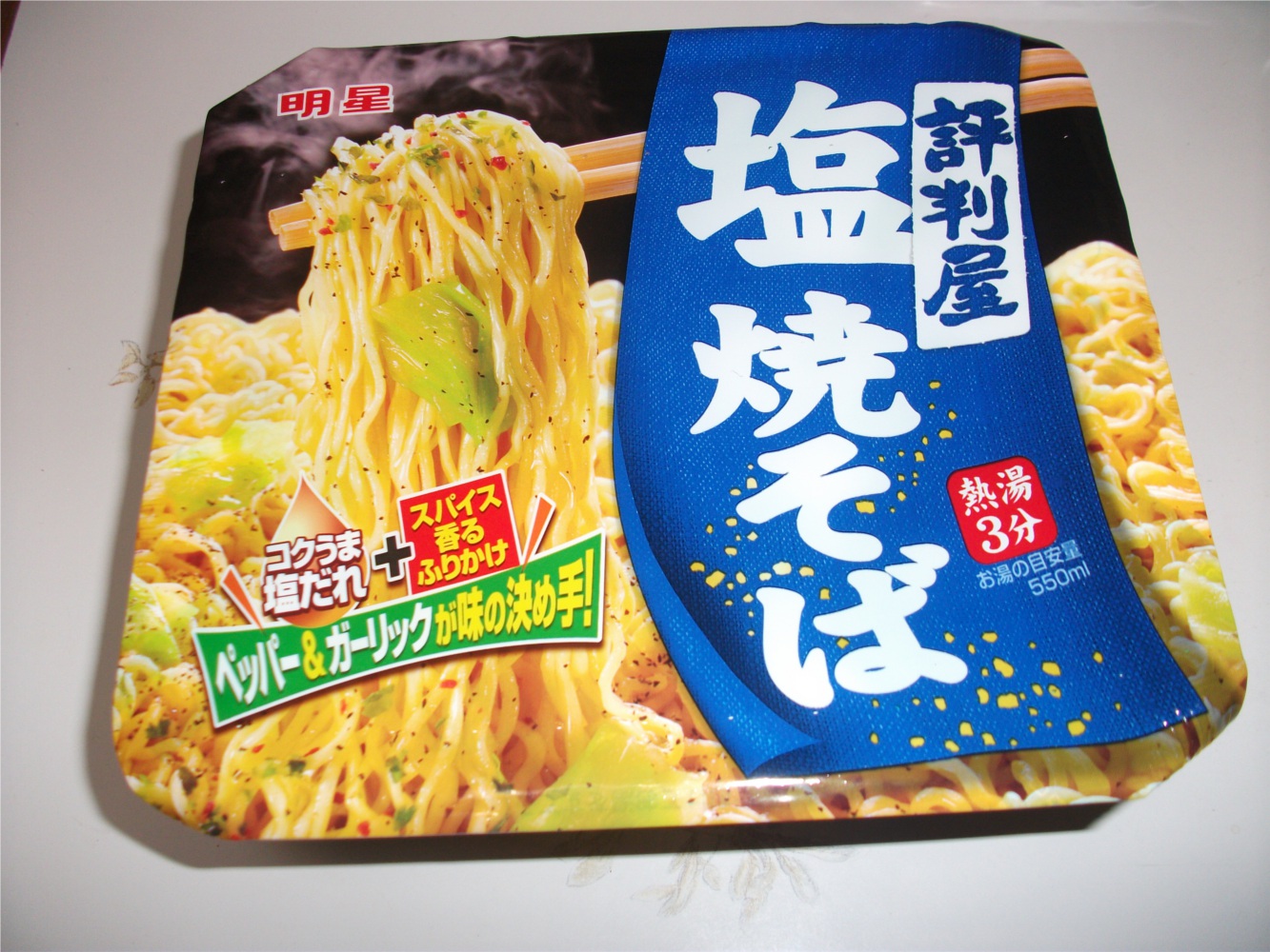 夜食の塩焼きそばはソースの色が薄いので、きちんと混ざってるか分かりづらい。