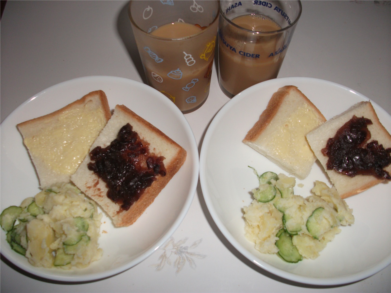 朝ごはんは、作り置きのポテトサラダ、生食パンにマーガリン&つぶあん、カフェオレ&牛乳mix。