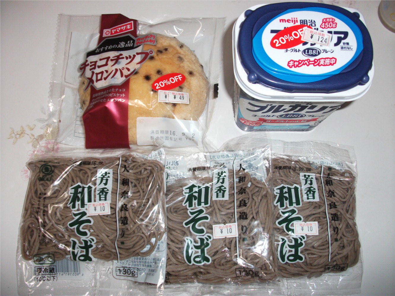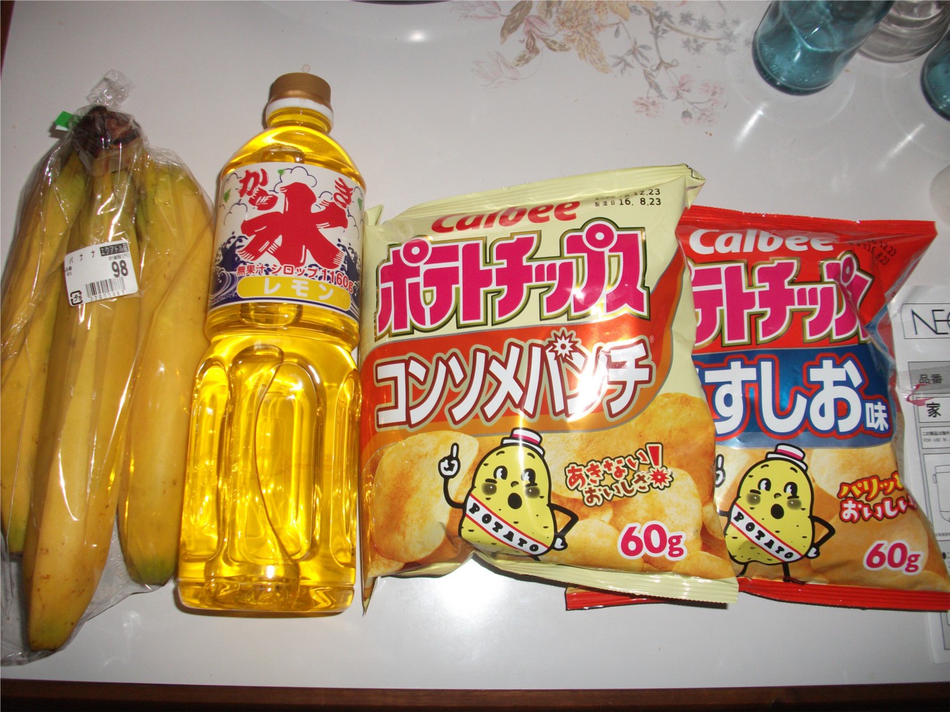 結構大きいバナナが4本98円だった。ポテチがひと袋55円。わらび餅45円 だったと思う。