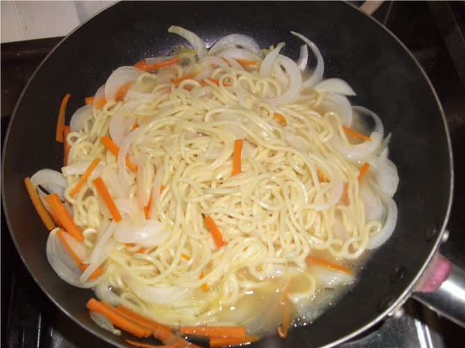 フライパンで野菜を炒め焼きそばを作りラーメンスープを加えます。