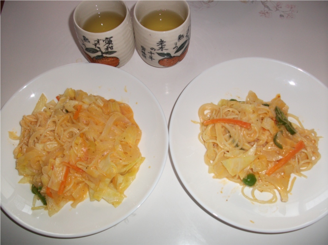 スパゲティを多めに茹でたのに10円袋麺を2袋買ったために残ってしまった。