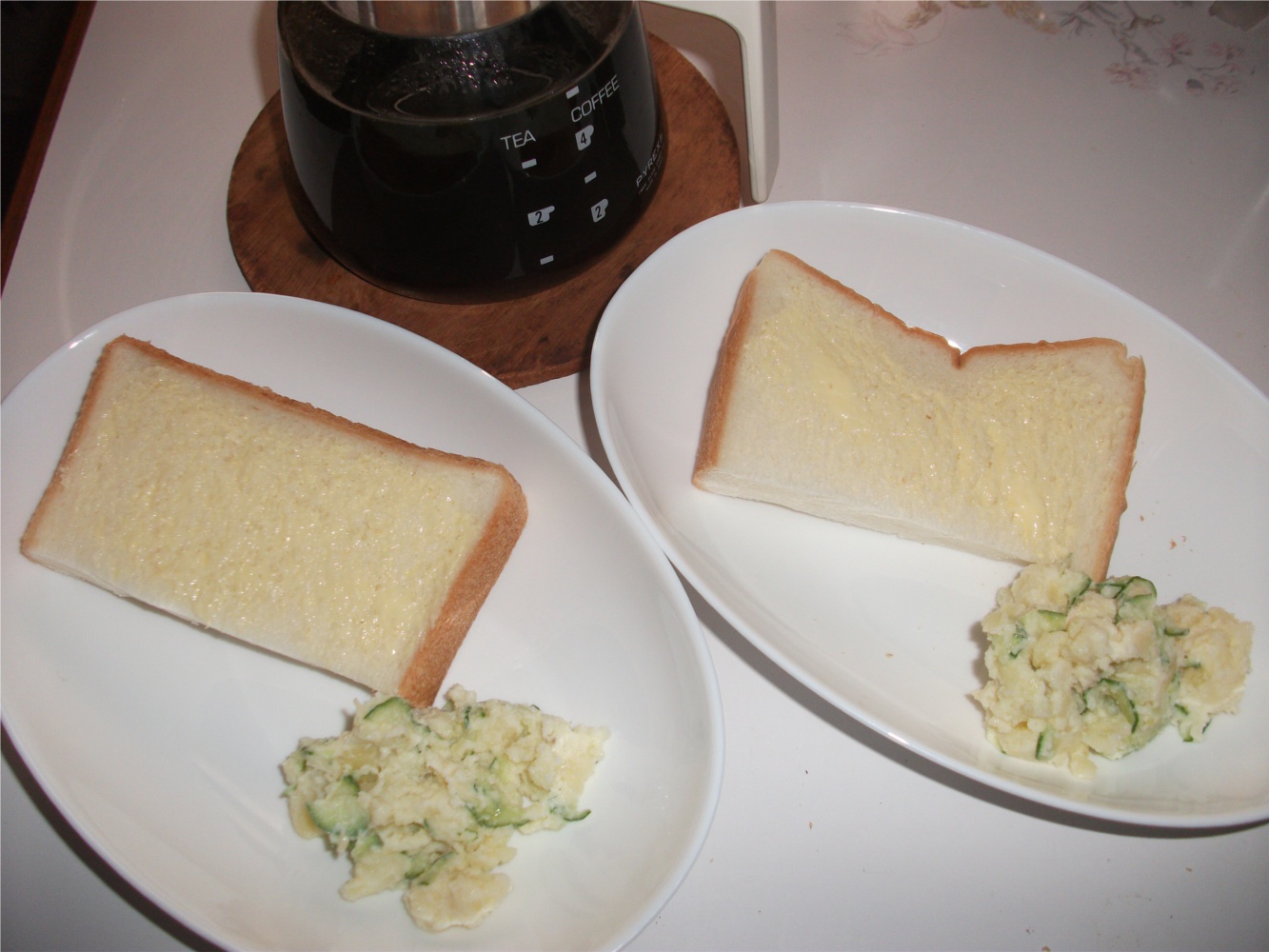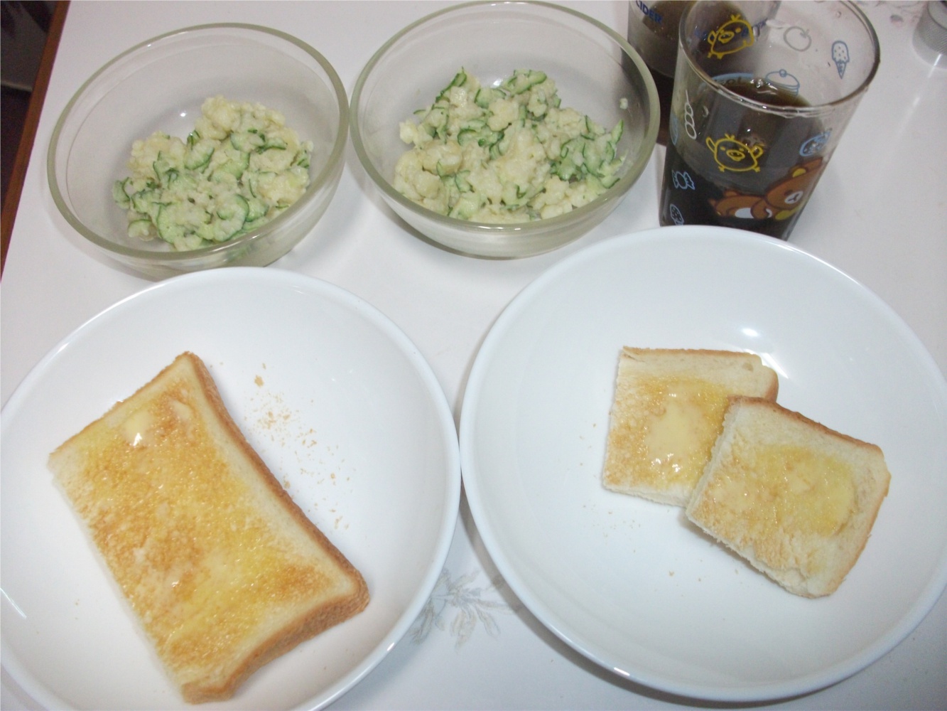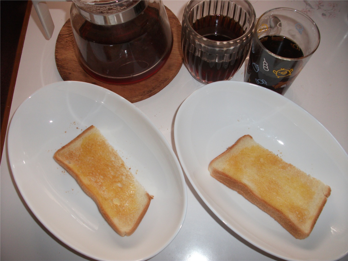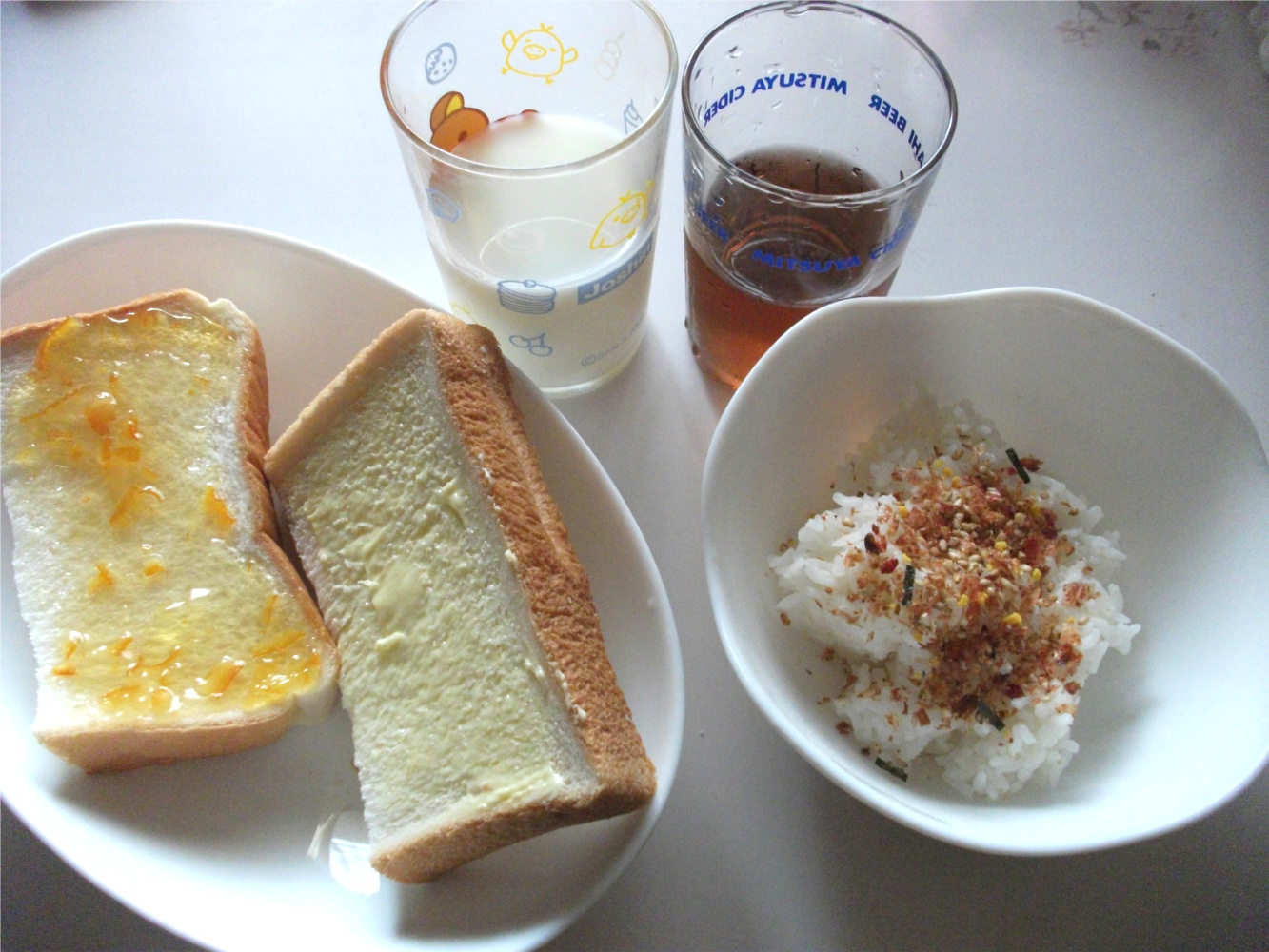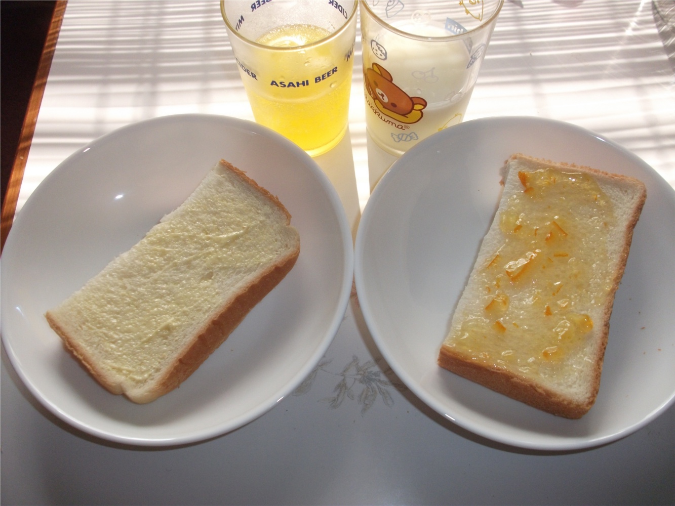 朝ご飯は、マーガリンを塗った生食パンとマーマレードを塗ったもの。牛乳がちょっとしか無かったので一方は炭酸オレンジ。どうせ全部口に入るので2個で一人分です (^~^)