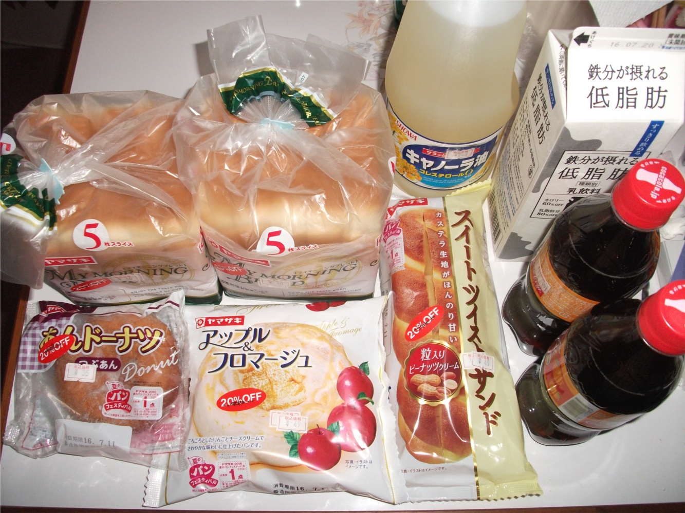 正規値は牛乳のみ、1.5Lサイダー一本91円、菓子パン各56円。