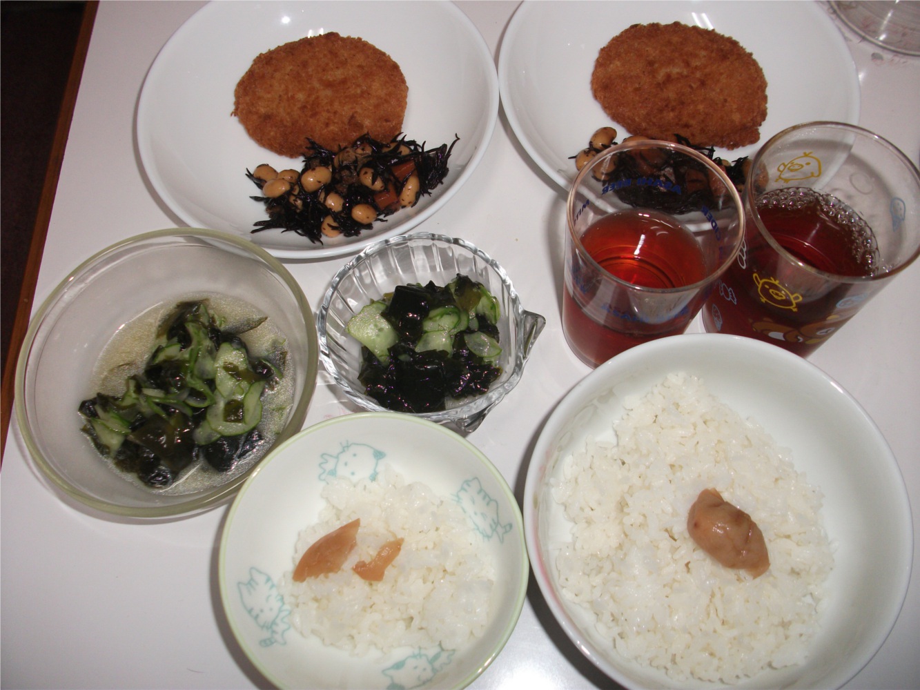 今夜は人並みに近い食事になったと思う。コロッケ、豆ひじき、酢の物。