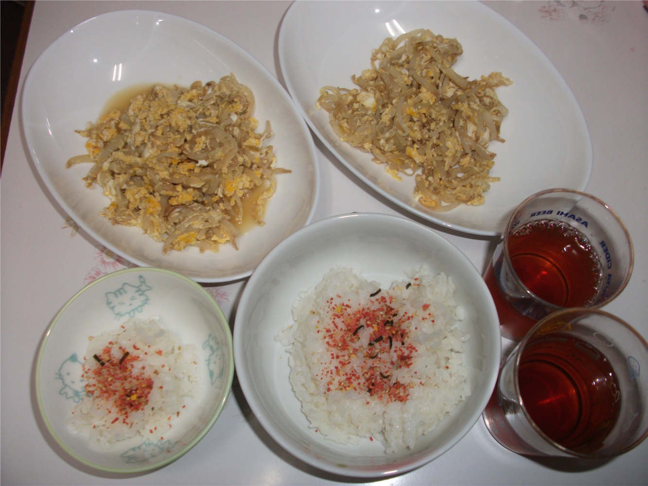 お昼にお米を食べたからかおやつは食べなかった。晩ご飯は、もやしの玉子とじです。もやし一袋と玉子2個使いました。