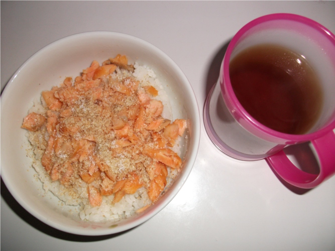 5切入り鮭を一度に全部火を通してしまったので、今日のお昼はほぐした鮭と入り胡麻と塩をご飯の上に乗せて戴きました。青いものが足りないですね。