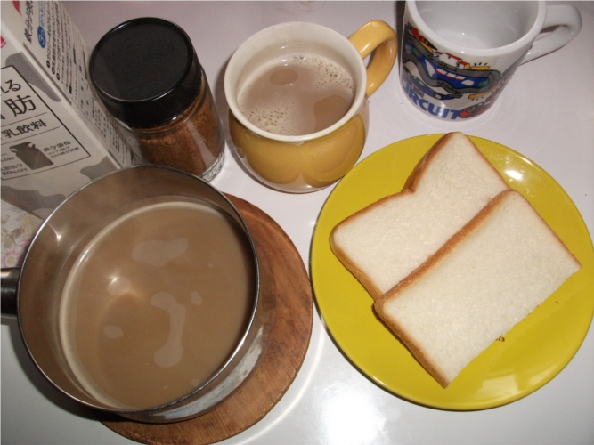 カップ一杯分残っていた牛乳と同量のお水とインスタントコーヒー、若干多めの砂糖で甘めのカフェオレにしました。
