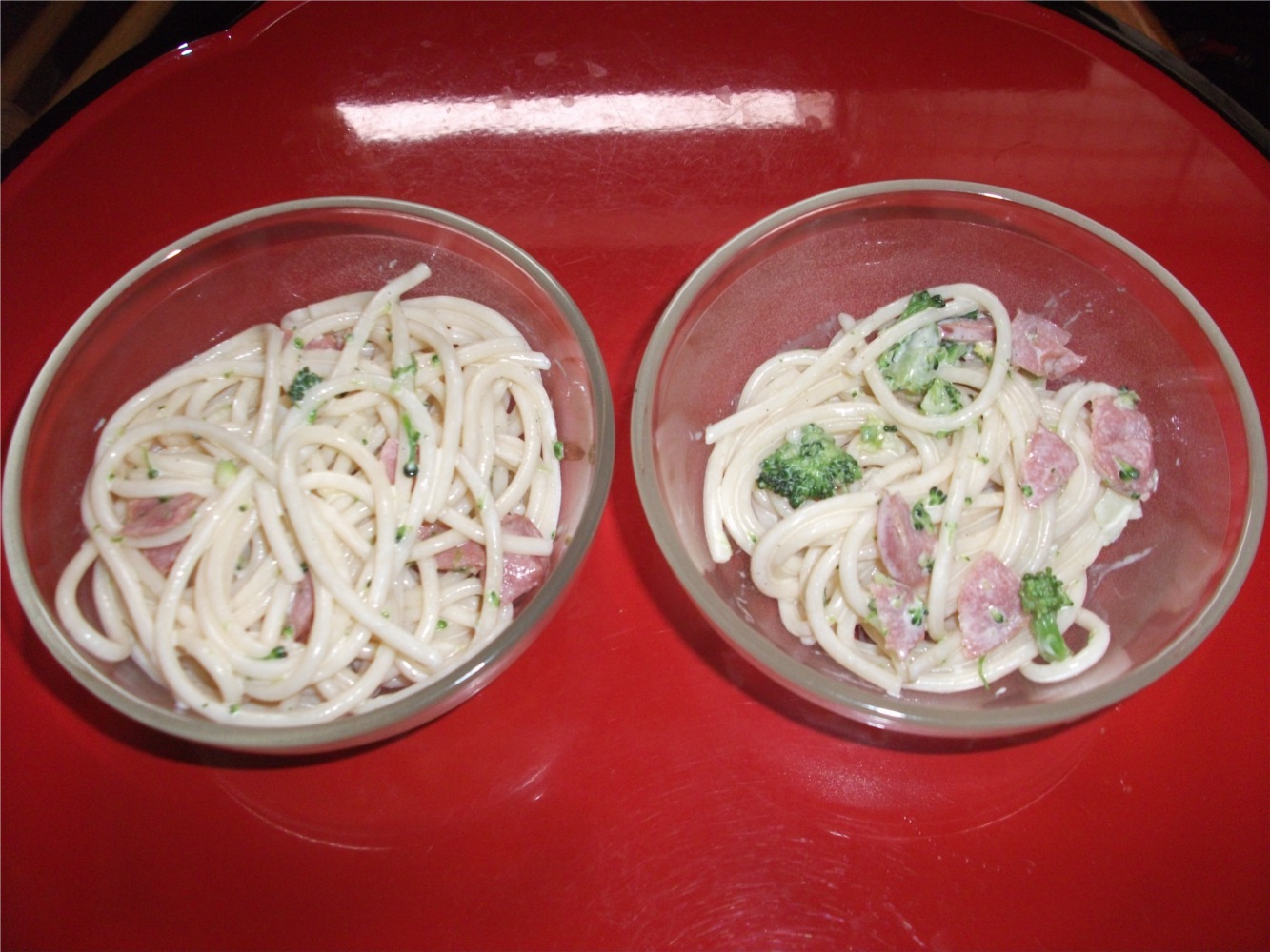 で今朝は、油無しで炒めたウインナーと茹でたブロッコリーのみの具でスパゲティーサラダを作った。