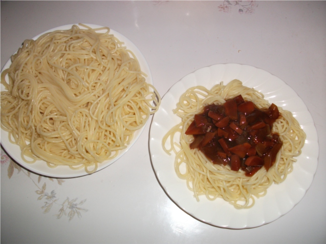 少しずつ残っている人参と玉ねぎを刻み、ウインナーを数本刻み、ミートソースもどきを作った。