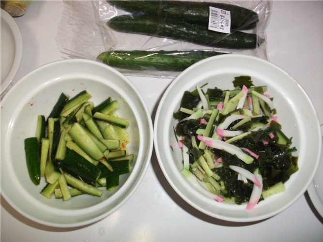 右は、わかめ・見切り品かまぼこを足して冷麺ごまダレに漬け込んだもの。